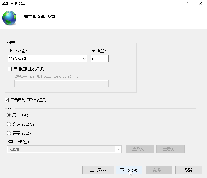 IP地址选择:全部未分配,端口为21号端口(默认),SSL选择“无”,点击下一步: