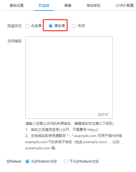 KS3提供的防盗链通过黑白名单的方式控制,其中黑名单用于添加禁止访问的来源域名,白名单用于添加允许访问的来源域名。防盗链功能可手动设置关闭。