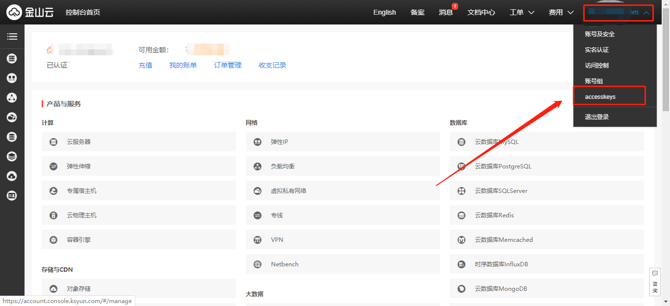 若KS3主账号有旧的KS3访问密钥,可以登录KS3控制台之后,点击右上角账户名,点击下拉菜单中的【accesskeys】查看。