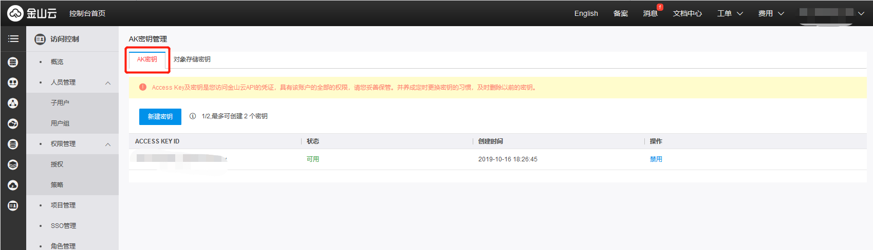 - 在访问控制(IAM)中创建的主账户访问密钥可以访问包括KS3在内的所有金山云服务。建议客户前往身份与访问控制管(IAM),管理主账号及IAM用户。请参考访问控制(IAM)文档。